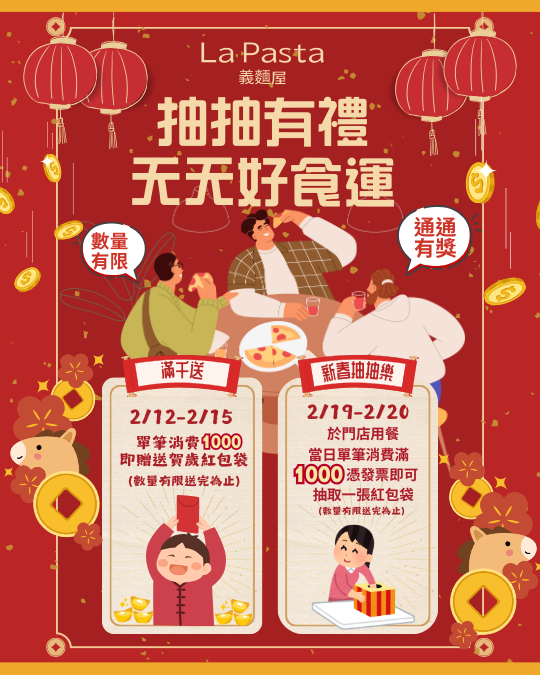 【抽抽有禮 天天好食運】新春加碼雙重好禮來啦!第一波|新春紅包袋贈送2/12 – 2/15單筆消費滿 1,000 元即可獲得「新春限定紅包袋」乙份(數量有限,送完為止)第二波|開工紅包抽抽樂2/19 – 2/20單筆消費滿 1,000 元即可抽紅包乙包(數量有限,送完為止)