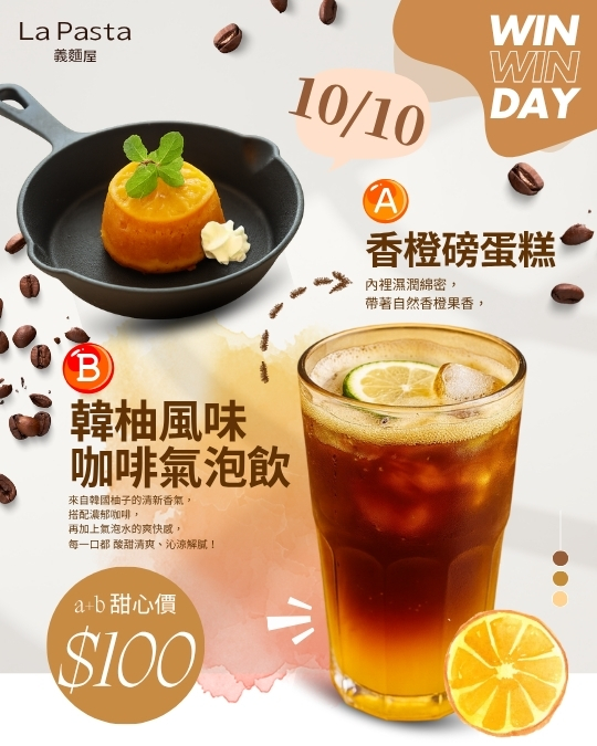A|香橙磅蛋糕 + B|韓柚風味咖啡氣泡飲組合甜心價 100 元酸甜香橙磅蛋糕搭配清爽韓柚氣泡飲,完美午後組合,一口甜、一口沁涼,幸福感爆棚活動日期:10/10 一日限定當日來店消費即可贈送 LINE 集點卡 1 點。