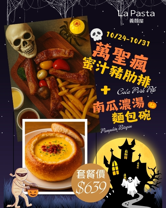 萬聖節限定登場!10/24 - 10/31一起來 LA PASTA 開吃「萬聖瘋」!萬聖瘋蜜汁豬肋排 + 南瓜濃湯麵包碗個人獨享價 $639 元甜蜜濃郁、邪惡滿分的組合~外酥內嫩的蜜汁豬肋排,搭配香氣撲鼻的南瓜濃湯麵包碗,一口接一口,讓人「魂不守嘴」