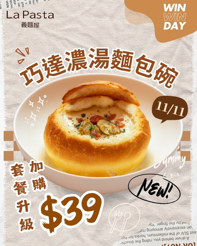 微涼的 11 月天,凡點套餐,加購 39 元即享湯品升級!用一碗濃郁香滑的【巧達濃湯麵包碗】療癒自己。溫度、香氣、酥脆與濃郁的完美結合,是屬於秋日的溫柔滋味。活動日期:11/11 一日限定當日來店消費即可贈送 LINE 集點卡 1 點。